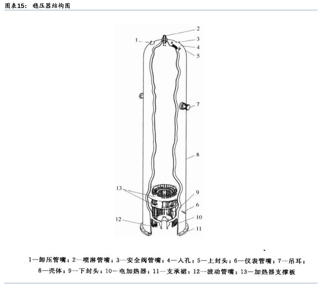 4) 稳压器(稳定一回路压力):稳定一回路冷却剂的压力,防止一回路超压,并限制冷却剂由于热胀冷缩引起的压力变化。正常功率运行时,稳压器内下部为水,上部为汽空间,由加热器使水处于饱和状态。一回路除稳压器上部的汽腔以外,其余部分全部充满水。因此稳压器汽腔的蒸汽压力传播到整个一回路系统,稳压器的压力代表了一回路的压力。当压力降低时,底部电加热器加热使部分水蒸发为饱和汽,蒸汽密度增加,压力增加;当压力增加时,顶部喷淋过冷水使部分蒸汽凝结,蒸汽密度降低,压力下降。当压力超过稳压器安全阀的阈值时,安全阀自动开启,将稳压器内部的蒸汽排放。