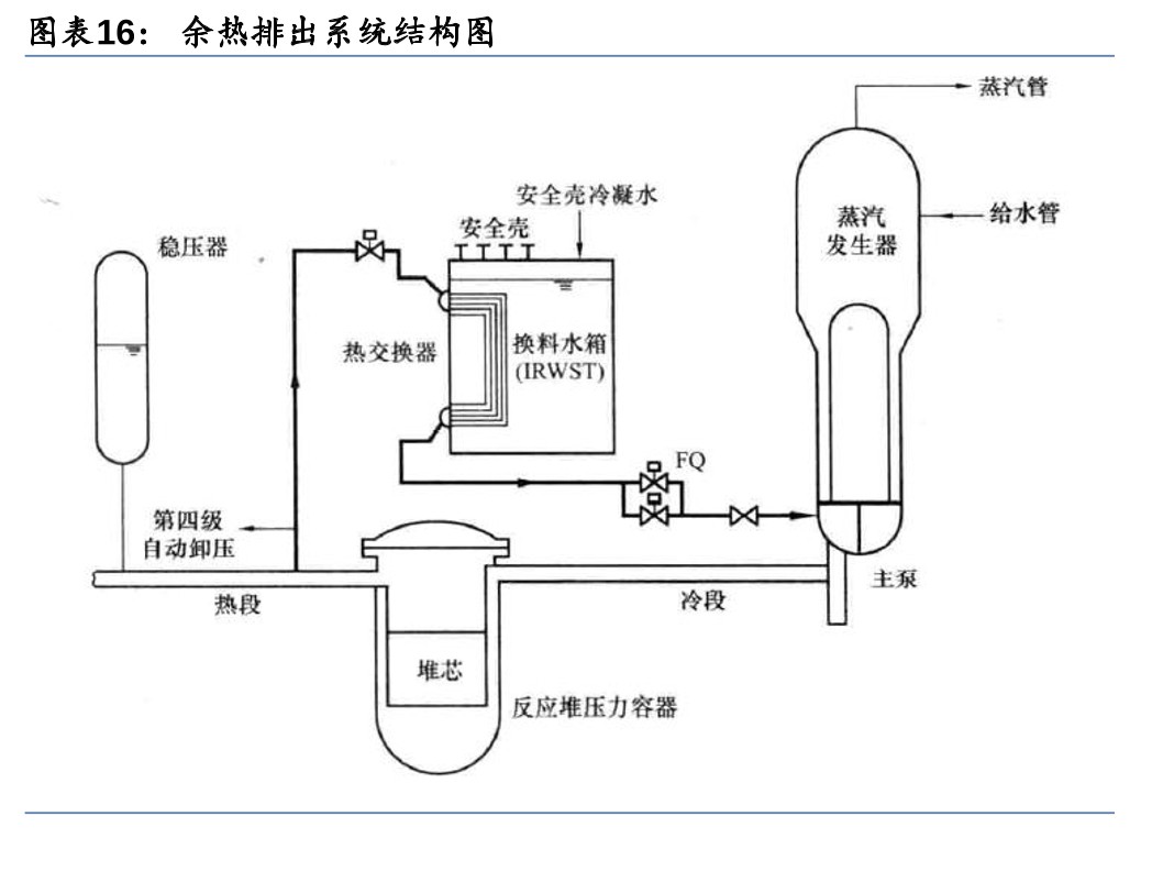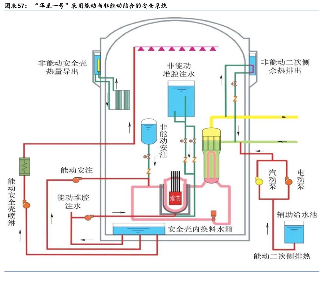 华龙一号(HPR1000):能动与非能动安全系统相结合,中国自主产权已实现出口验收华龙一号采用能动与非能动相结合的安全系统。中国自主三代核电华龙一号已实现出口并通过验收。华龙一号以能动和非能动的方式实现应急堆芯冷却、堆芯余热导出、熔融物堆内滞留和安全壳热量排出等功能。在核岛布置设计中考虑了安全系统和正常运行系统间充分的物理隔离,专设安全系统主要布置在两个安全厂房内,正常运行系统主要布置在反应堆厂房、电气厂房、燃料厂房及核辅助厂房内;同时冗余的两个安全系列分别布置在两个安全厂房中并且由独立的应急柴油发电机供电。两个安全厂房位于反应堆厂房两侧,两个应急柴油发电机厂房也分别布置在核岛的两个角落,实现了实体隔离。专设安全系统主要包括安全注入系统、辅助给水系统与安全壳喷淋系统。