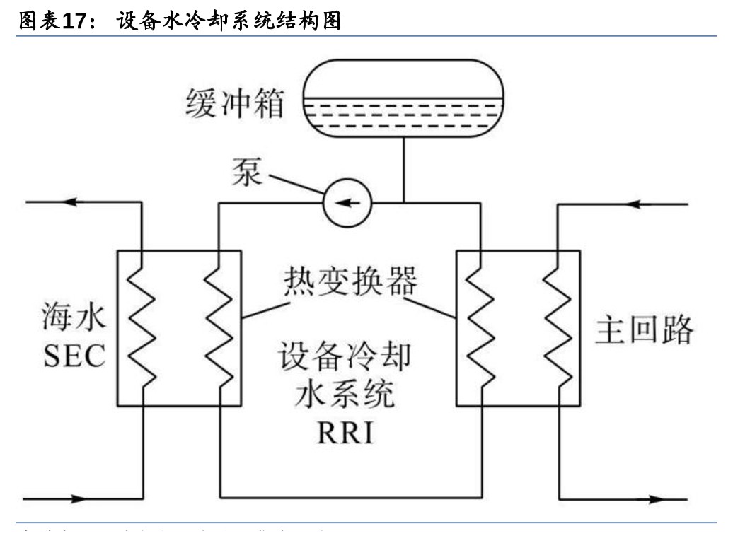 6) 辅助给水系统:在电厂启动、热备、热停和从热停向冷停堆过渡的第一阶段,代替主给水系统向蒸汽发生器二次侧供水;在事故工况下,向蒸汽发生器应急供水,排出堆芯余热。