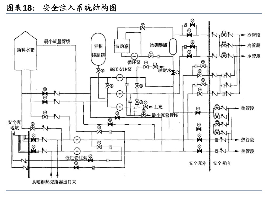 1) 安全注入系统:又称紧急堆芯冷却系统,当一回路系统发生破口失水事故时,将硼酸溶液注入堆芯;当二回路主蒸汽管道破裂时,向一回路注入高浓度硼酸溶液。典型的安全注入系统包括高压安全注入、中压安全注入和低压安全注入三个子系统,分别对应不同的一回路压力。