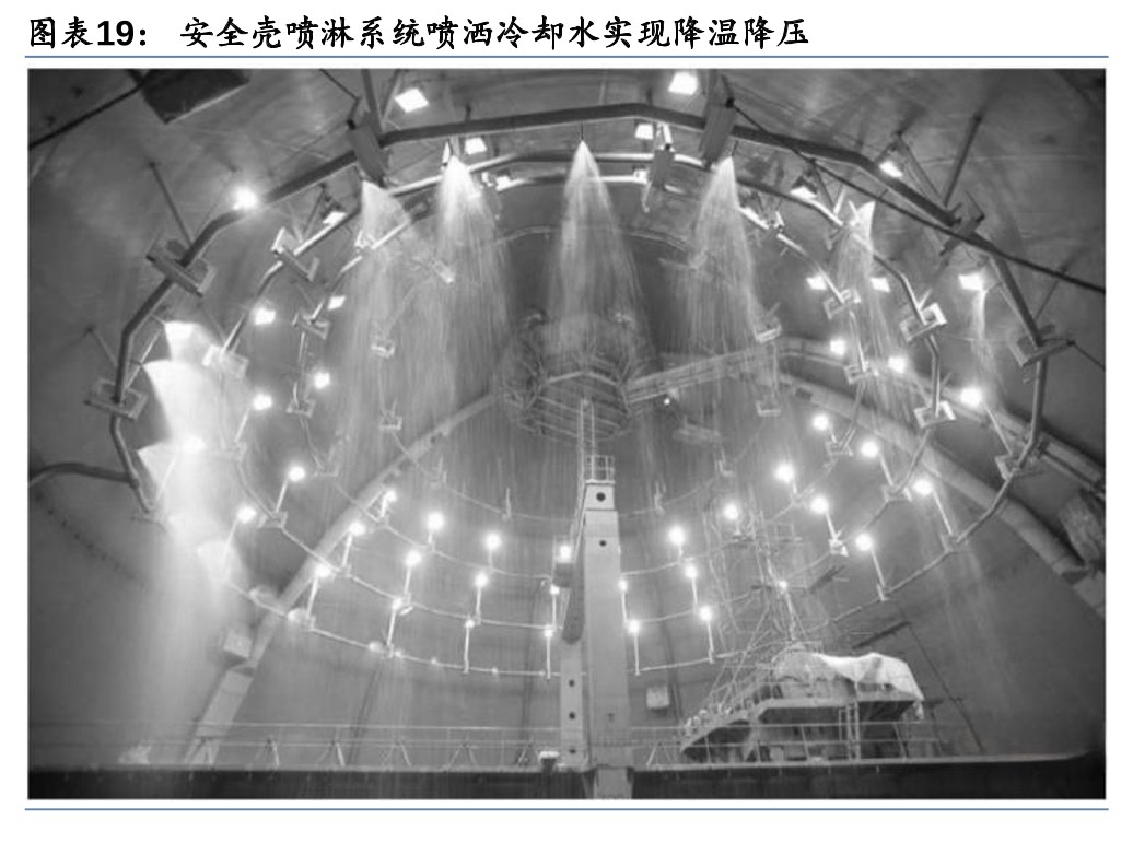 3) 安全壳喷淋系统:通过喷淋,冷凝由于主冷却剂管道破裂或主蒸汽管道破裂事故时释放到安全壳内的蒸汽,将安全壳内的压力和温度控制在设计限值以内,从而保持安全壳的完整性。