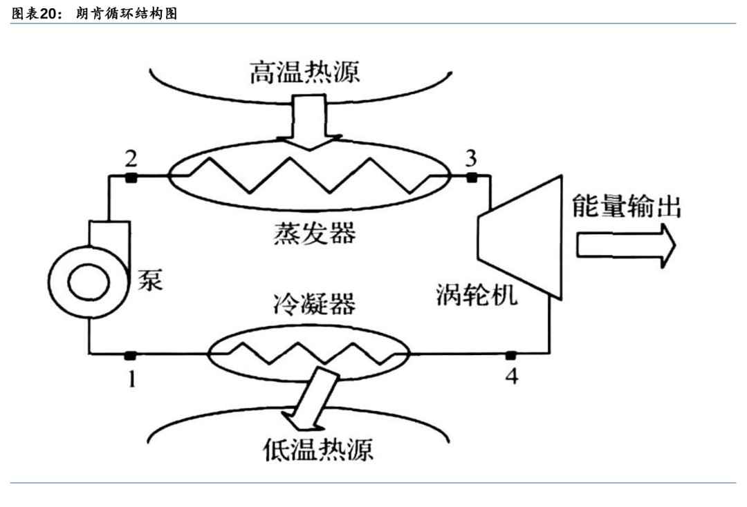 二回路采用蒸汽朗肯循环进行热力循环。朗肯循环一种以蒸汽作为工质的热力循环过程,其动力装置构成包括蒸汽发生器、过热器、蒸汽轮机、凝汽器和水泵。来自于给水泵的凝结水在蒸汽锅炉中吸热汽化成饱和蒸汽,饱和蒸汽在过热器中继续定压吸热成为过热蒸汽,过热蒸汽进入到蒸汽轮机膨胀做功带动发电机发电,蒸汽轮机作功后的乏汽进入到凝汽器凝结放热,放出的凝结热被冷却水带走,凝结水进入给水泵,从而完成一个循环。
