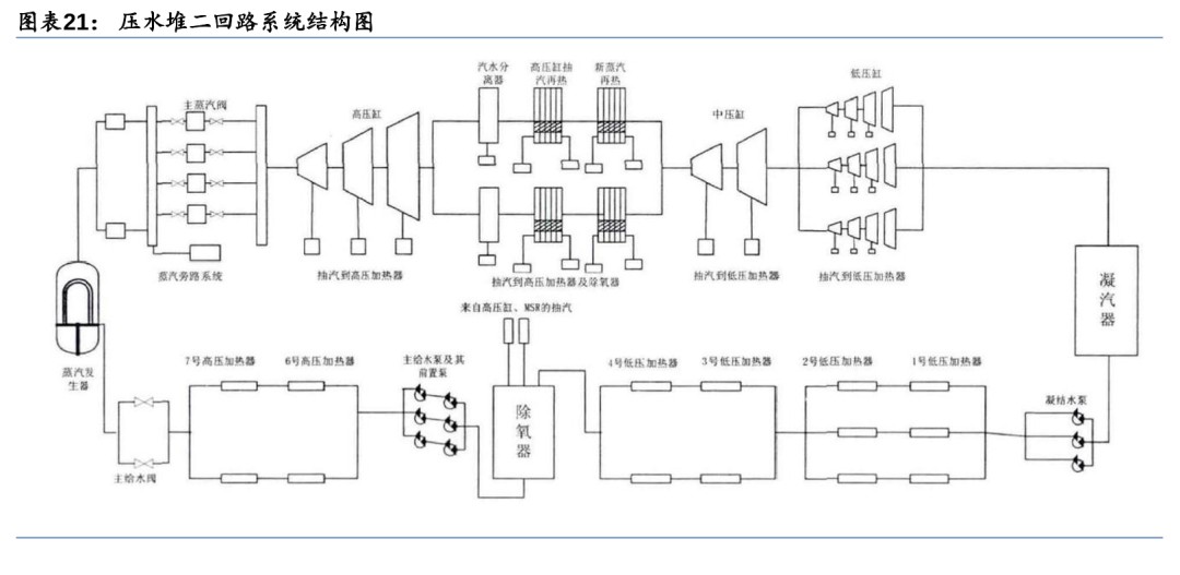 压水堆二回路系统由汽轮机发电机组、凝汽器、凝结水泵、给水加热器、除氧器、给水泵、蒸汽发生器、汽水分离再热器等设备组成。蒸汽发生器的给水在蒸汽发生器吸收热量变成高压蒸汽,然后驱动汽轮发电机组发电,做功后的乏汽在凝汽器内冷凝成水,凝结水由凝结水泵输送,经低压加热器进入除氧器,除氧水由给水泵送入高压加热器加热后重新返回蒸汽发生器,形成热力循环。