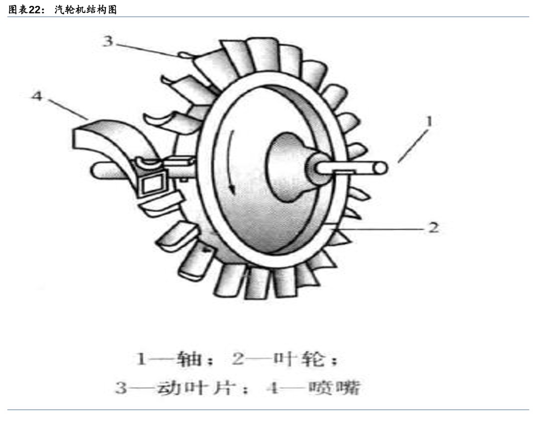 1) 汽轮机(将热能转化为机械能):将高温高压蒸汽的热能转化为机械能。在汽轮机中,蒸汽在喷嘴中发生膨胀,压力降低,速度增加,热能转变为动能。高速汽流流经动叶片时,由于汽流方向改变,产生了对叶片的冲动力,推动叶轮旋转做功,将蒸汽的动能变成轴旋转的机械能。