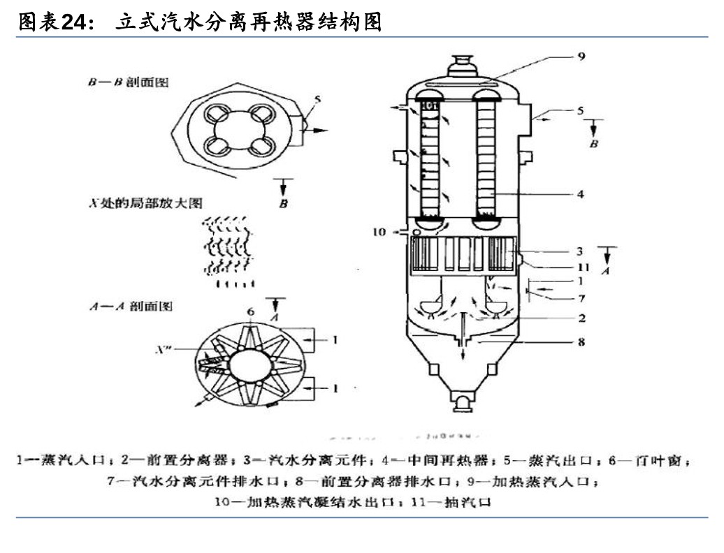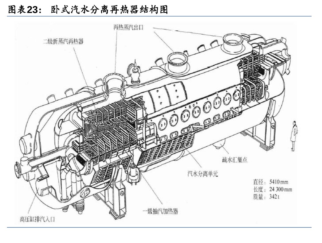 2) 汽水分离再加热器(分离再加热高压缸蒸汽):蒸汽在汽轮机高压缸内膨胀做功后,从高压缸排出的蒸汽湿度较高。若不采取任何措施,使该蒸汽流入低压缸继续做功,将导致汽轮机效率降低,甚至对汽轮机叶片产生冲蚀,导致汽轮机事故。汽水分离再加热器用于将从汽轮机高压缸出来的排汽经汽水分离后再加热,提高汽轮机效率。高压缸排汽从汽水分离再热器的壳侧流进,先经过汽水分离装置利用湿蒸汽中水滴具有较大质量和惯性的特性去除水分后,再依次流经一级加热器、二级再热器后流出壳体,进入低压缸做功。按结构形式,汽水分离再热器有卧式和立式两种,立式结构由于重力作用,可以使加热蒸汽在管内凝结后生成的凝结水更易于排出。