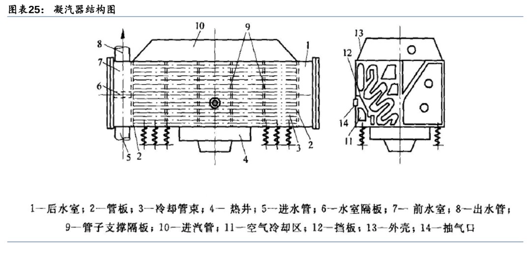 3) 凝汽器(凝结汽轮机乏汽):接收汽轮机低压缸的排汽、旁路排放蒸汽等,并将其凝结成水,构成封闭的热力循环。汽轮机排汽流过凝汽器传热管外表面时,将热量传递给在管内流动的循环水,使蒸汽在传热管外表面凝结。凝汽器最终接收并冷却反应堆运行过程中产生的热量,是反应堆的热阱。