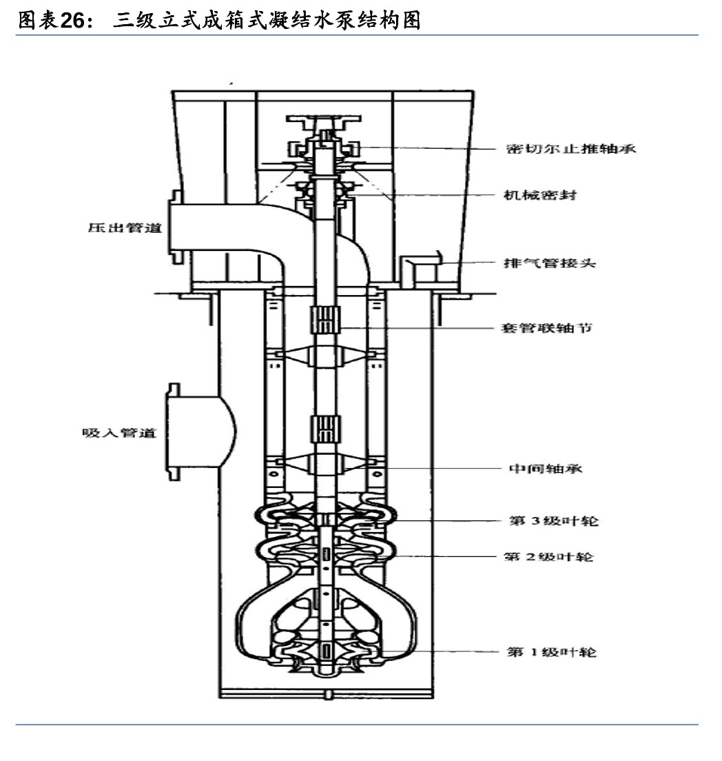 6) 疏水泵(泵送疏水至管路):加热蒸汽在加热器或管道内的凝结水称为疏水,疏水泵将回热加热器壳侧的疏水升压后送入凝结水或给水管路中。