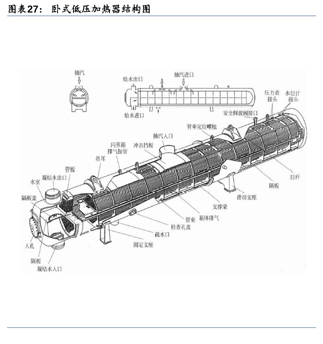 5) 给水加热器(加热给水和凝结水):利用汽轮机抽汽对给水和凝结水加热,以提高热循环的经济性。回热加热器按汽水介质传热方式的不同可分为混合式和表面式两种。混合式加热器为汽水直接混合传热;表面式则由传热管将加热蒸汽和被加热水分隔开,通过传热管壁实现热传递。按表面式加热器水的侧压力不同,位于凝结水泵和给水泵之间的加热器属于低压加热器,给水泵下游的加热器为高压加热器。