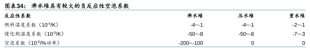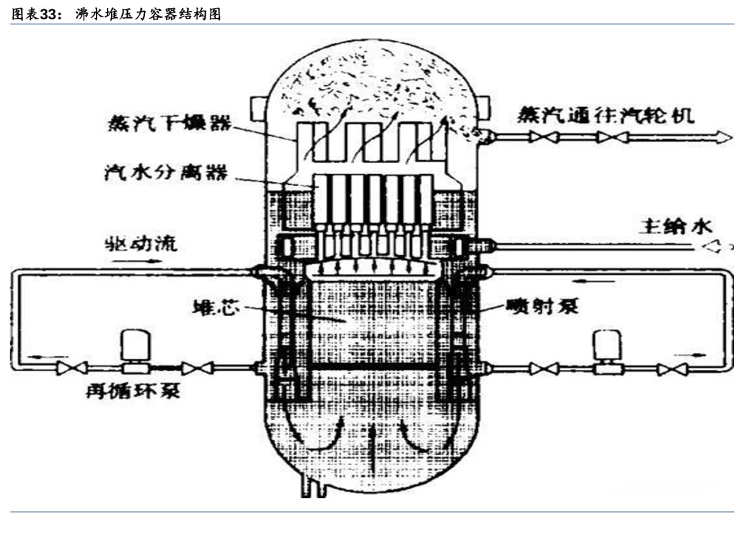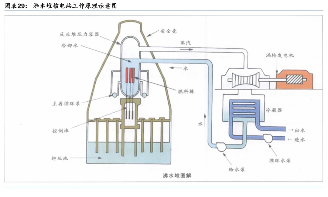 沸水堆系统简化事故减少/能自动调节功率,但存在放射性物质泄露和机构故障风险。沸水堆的优点在于:系统简单,工作压力较于压水堆(150个大气压)减半,省去了压水堆电站中的易出现事故的蒸汽发生器和稳压器,使电站回路事故减少;具有较大负反应性空泡系数,能够自动调节反应堆功率,使反应堆运行更稳定。其缺点在于:水沸腾后密度降低,慢化能力减弱,导致功率密度降低;沸水堆蒸汽由堆内直接产生进入汽轮机,导致O-16经过(n,p)反应后产生的N-16的泄露,N-16有很强的γ辐射,因此汽轮机组正常运行时会带有很强的放射性;控制棒驱动结构在堆芯底部,一旦发生紧急停堆事故,控制棒不能依靠重力下降,存在因机构故障而不能插入反应堆的风险。