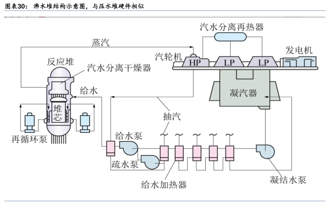 沸水堆(BWR):轻水沸腾直接做功,单一回路结构简单