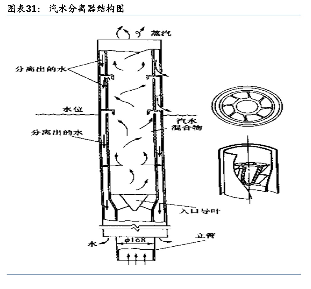 1) 汽水分离器(分离水和蒸汽):汽水分离组件由349个三级式分离装置平行排列组成,汽水混合流体从堆芯上部的空腔经过立管进入汽水分离器的下端,入口处的叶片使汽水混合物向上流动的同时产生旋转运动,利用离心效果分离水和蒸汽。