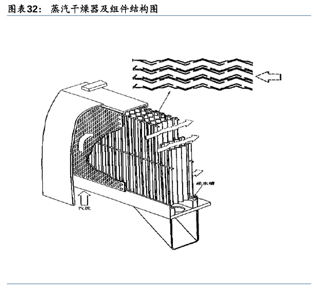 2) 蒸汽干燥器(干燥蒸汽):通过进一步分离蒸汽中的湿分使蒸汽干燥。蒸汽干燥器由六个干燥组件构成,干燥组件由干燥单元及两侧固定用的圆孔网板构成,干燥单元是在由整块薄钢板压制成的波浪形板上焊接断续的波浪形翼片而形成的。