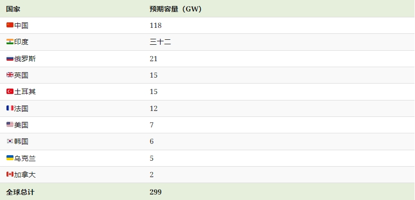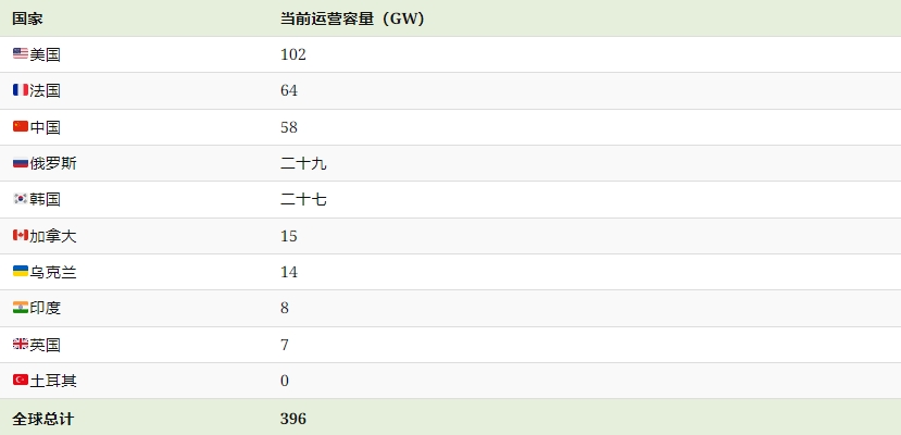 法国(64 吉瓦)和中国(58 吉瓦)分别位居核电装机容量第二和第三位。跻身全球前五的其他国家是俄罗斯(29 吉瓦)和韩国(27 吉瓦)。