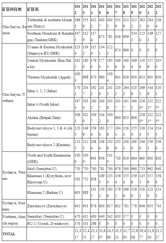 哈萨克斯坦共有13个铀矿项目,3个由 KAP独资拥有,10个为合资项目,与外资按照份额分配产量。2020年,KAP产量份额为10736吨,同比下降19%,(2019年 13291 吨),排在 Orano、Cameco 和 Uranium One 之前。202年,KAP产量份额为11373吨。