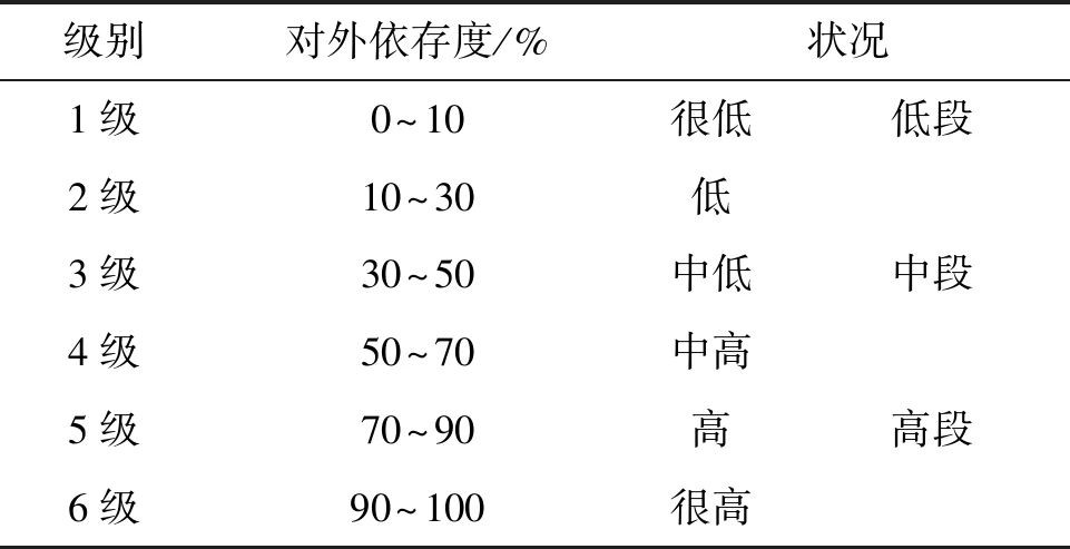 此外,学界将对外依存度从0~100%由低到高进行了6个级别划分,以起到预警作用,见表1。对外依存度低段包括1级(0~10%)和2级(10%~30%),表示对外依赖程度低,产品供应安全;对外依存度中段包括3级(30%~50%)和4级(50%~70%),表示对外依赖程度已经进入警戒范围,必须采取相应措施以保障产品供应安全;对外依存度高段包括5级(70%~90%)和6级(90%~100%),表示对外依赖程度高,产品供应安全风险很大。