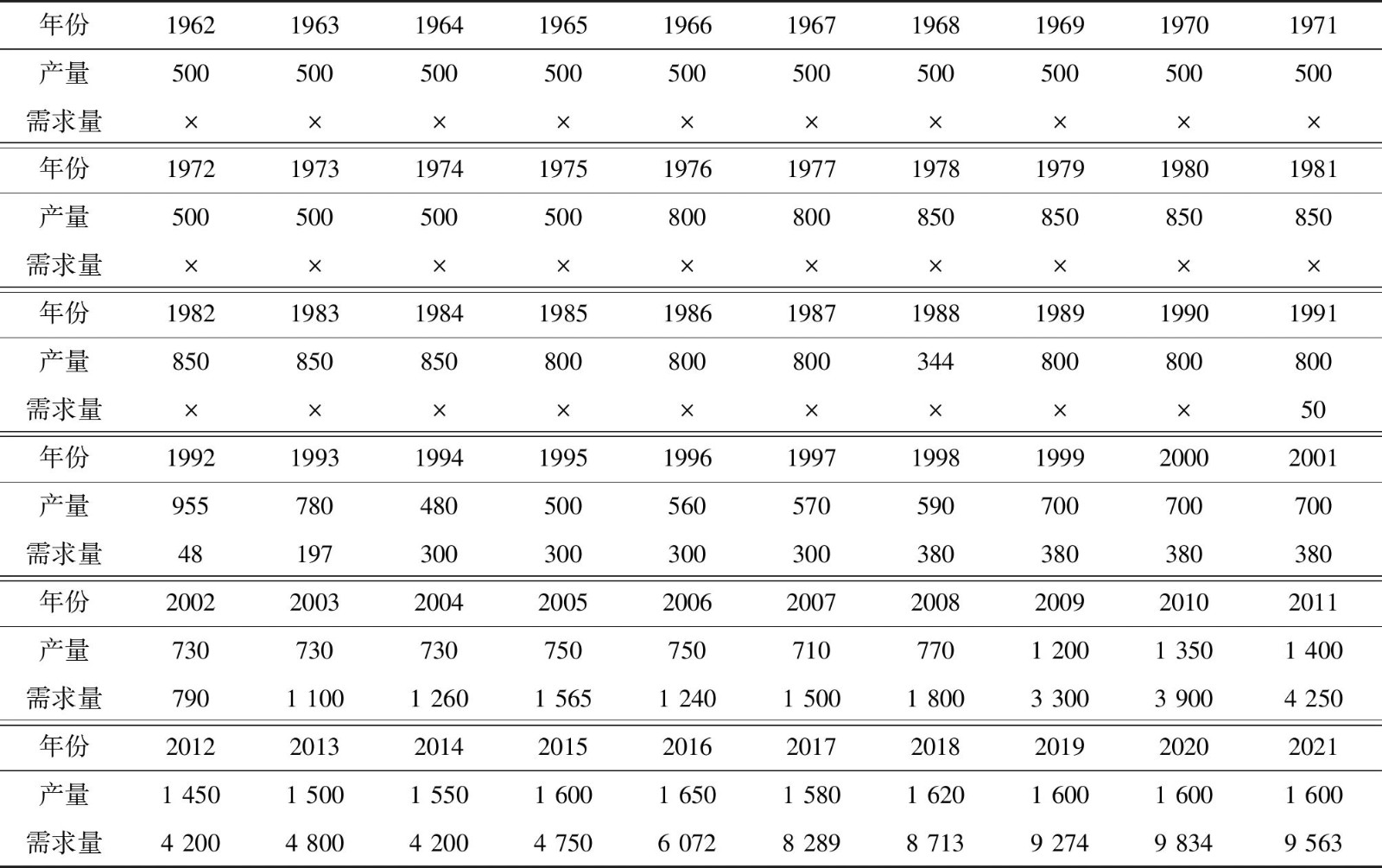 表2 1962—2021年我国铀资源生产与需求情况 (tU)