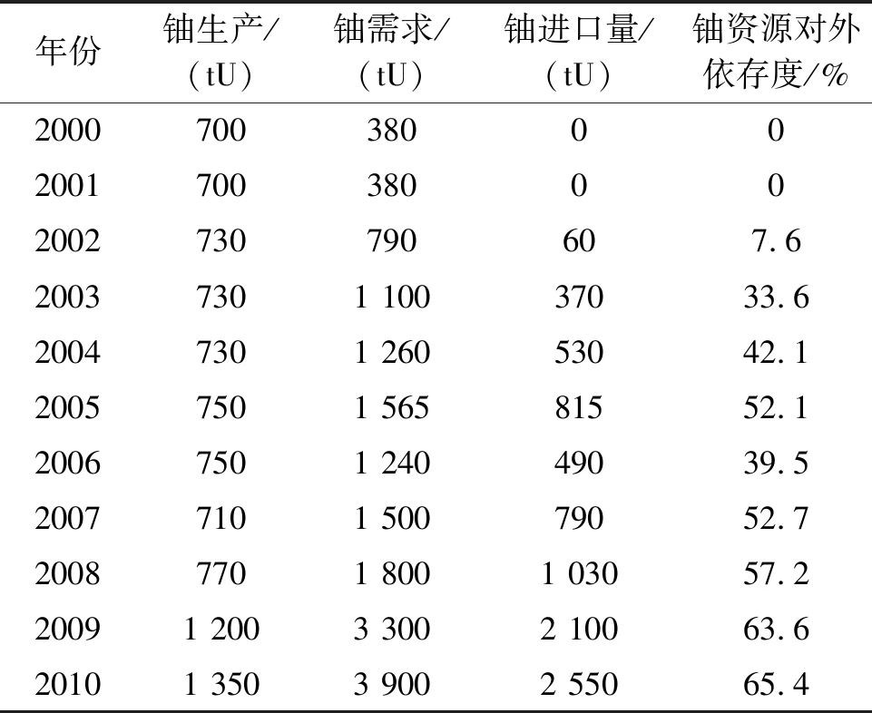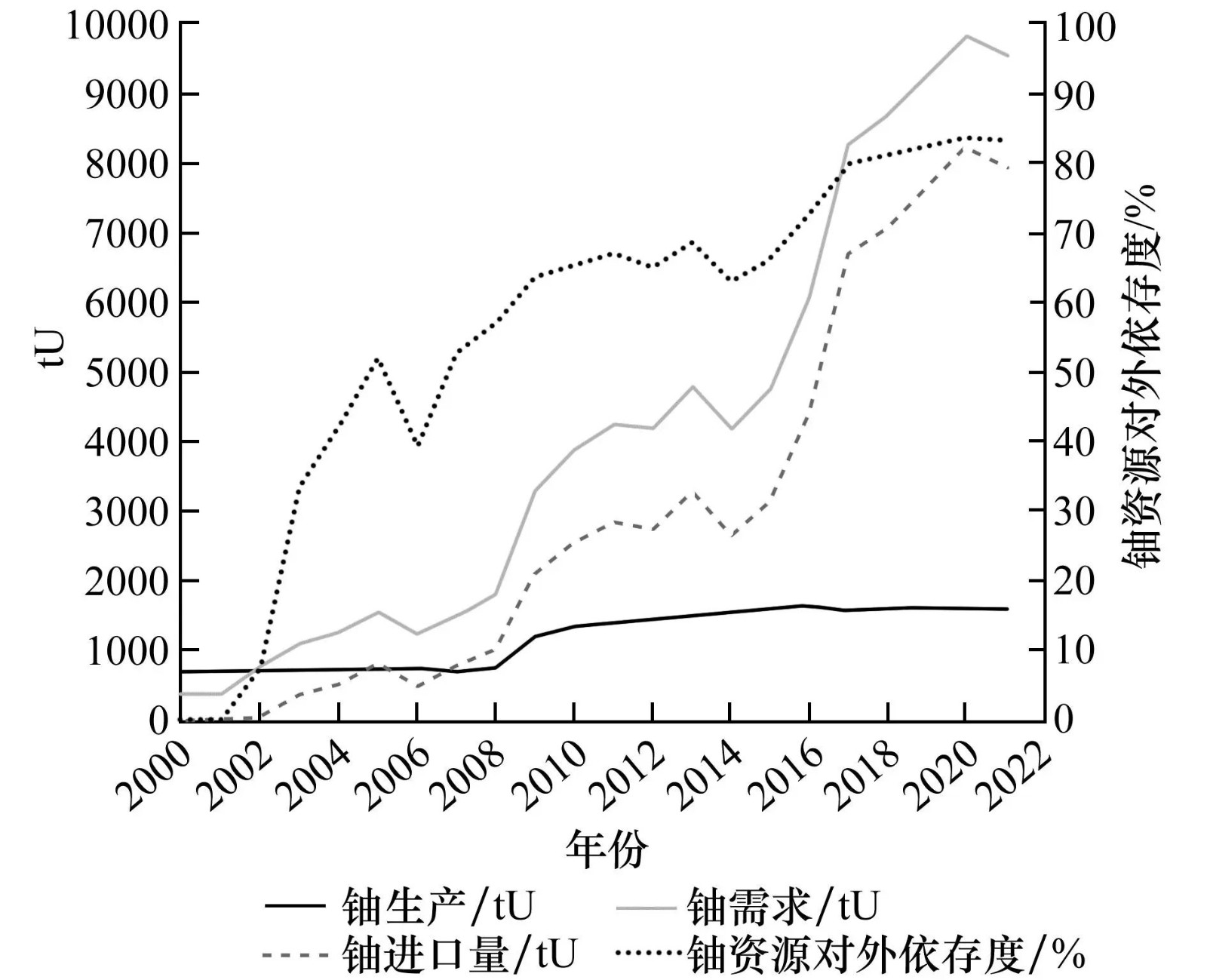 作为一种技术成熟的清洁能源,核电已经成为我国能源建设的重要选择。为了弥补核电燃料铀资源的国内生产量不足,我们不仅要开发利用海外铀资源,还要确保国际贸易铀资源供应。学术界通常采用依存度来考察一国经济对他国经济或对世界经济相互依赖的程度。借鉴此概念,可以采用铀资源对外依存度来考察我国铀资源对国际市场的依赖程度。深入探讨我国铀资源对外依存度,不仅有利于了解我国铀资源对外依赖程度和铀供应安全现状,而且有利于推进国际能源合作和提升我国铀资源安全保障能力。21世纪,在国际节能减排和国内生态治理的双重压力下,中国选择了大力发展核电等低碳能源产业。随着我国核电事业的发展,铀资源的需求在不断攀升。尽管通过加大铀资源勘探采冶力度,我国铀生产能力得到大幅度提升,但是相对核电发展的燃料需求而言,国内铀生产能力仍然远远不足。也就是说,国内铀资源生产与需求缺口在不断扩大,我国铀资源对外依存度在不断升高。
