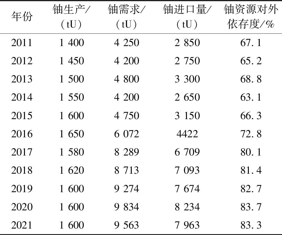 铀资源对外依存度=(铀资源需求量-国内铀生产量)/铀资源需求量×100%