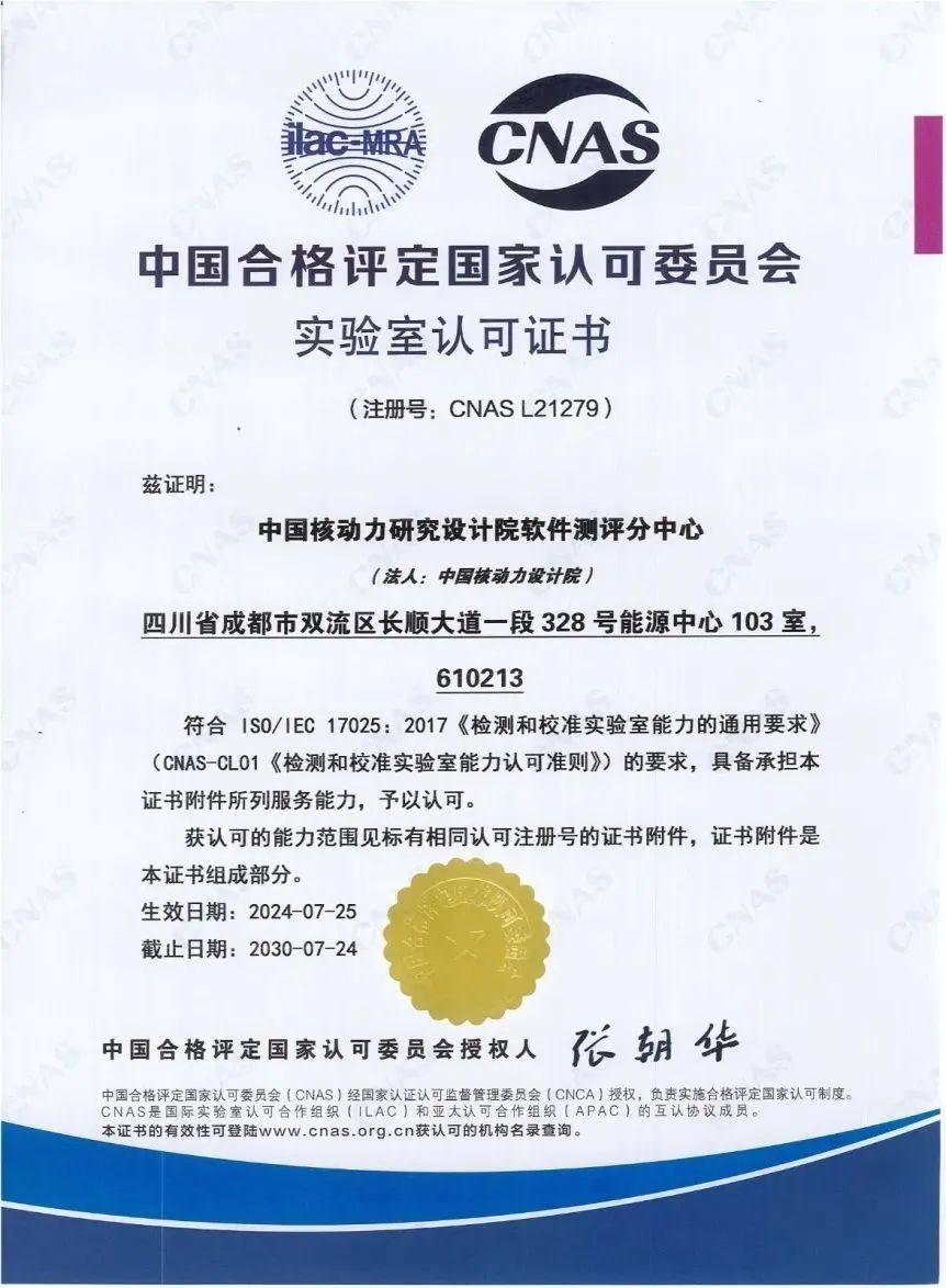 近日,中国核动力研究设计院软件测评分中心正式收到中国合格评定国家认可委员会(CNAS)组织颁发的实验室认可证书,在通用应用软件、嵌入式软件、可编程逻辑器件软件三个方向共35项测试能力获得CNAS认可,标志着核动力院软件测评能力及质量水平达到国际专业标准。