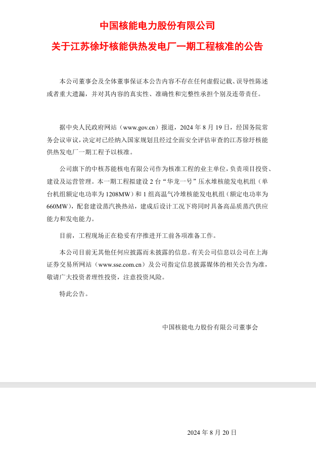 消息发布后,中国核电(全称为“中国核能电力股份有限公司”)发布了“关于江苏徐圩核能供热发电厂一期工程核准的公告”。公告显示,8月19日,经国务院常务会议审议,决定对已经纳入国家规划且经过全面安全评估审查的江苏徐圩核能供热发电厂一期工程(以下简称“核准工程”)予以核准。