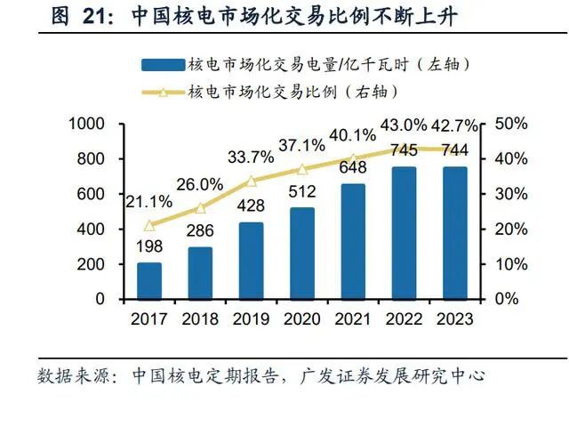 核电市场化比例提升,近两年市场化电价上涨。伴随各省陆续推进市场化交易,核 电市场化比例提升,根据中国核电和中国广核定期报告,截至2024年底,中国核电 市场化交易比例达42.7%,中国广核市场化交易比例达57.3%,2022年起,全国市场 化交易电价上浮,以中国核电田湾核电站所在的江苏为例,近三年年度长协电价上 浮比例超15%,也高于田湾核电标杆电价,而江苏并不限制核电交易电价。