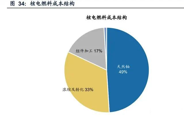 核电营业成本主要为折旧、燃料成本、运维费用等。以中国广核为例,2023年公司 的营业成本结构中,固定资产折旧占比30.9%、核燃料成本占比24.9%、核电运维占 比34%、计提乏燃料处置金占比10.2%。折旧成本与投资相关,三代核电单位投资整 体高于二代核电,折旧年限也更长;核燃料成本主要受铀价影响,但核电上市公司 已签订长协合同锁定价格;运维成本主要为检修、员工费用等支出;乏燃料处置金 按照已商运五年以上压水堆核电机组的实际上网销售电量征收,征收标准为0.026元 /千瓦时。