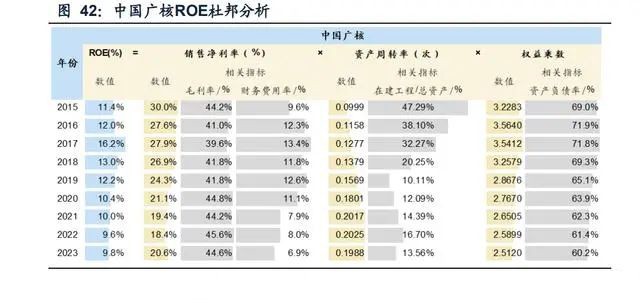 与长江电力的模式不同,中国核电和中国广核的资产主要通过自建形成,因此体内 在建工程比例较高,总资产周转率偏低,两者对比,中国广核的在建工程比例偏低 (集团建设惠州、苍南核电),资产周转率明显高于中国核电,当在建工程转固后, 资产周转率呈提升趋势,中国核电将更为明显;同时在建工程带来较高的资产负债 率,且高资本支出预计将持续较长时间,短期资产负债率难以降低,长期稳定运营 后、将类似长江电力逐步降低资产负债率;核电净利率类似长江电力、毛利率较为 稳定,受财务费用影响较大,资产负债率下降将带动财务费用下降、净利率提升。总 体来看,在资本开支高峰期、在建工程比例较高,ROE仍能维持当前水平,未来资 本开支下降、在建工程转固后、核电ROE有望提升。