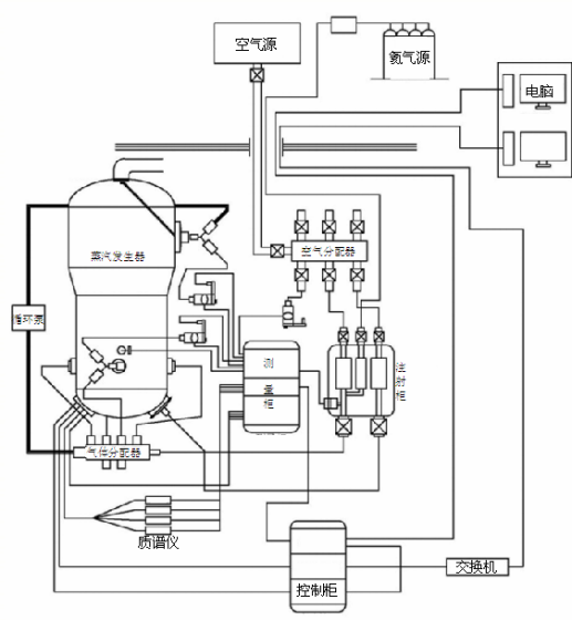 该系统主要由质谱仪、气体混合器注射系统、以及数据采集和分析系统三部分组成。