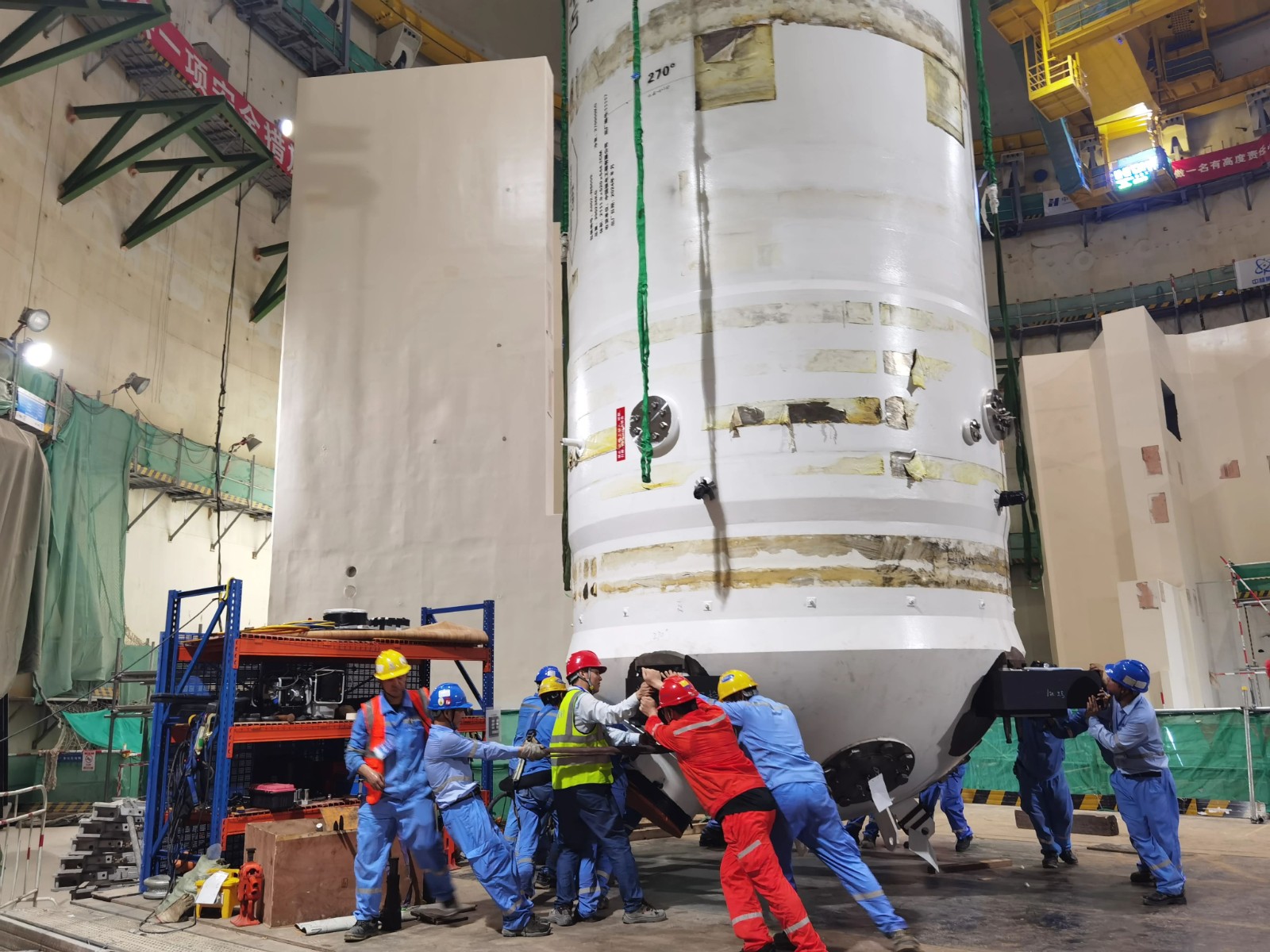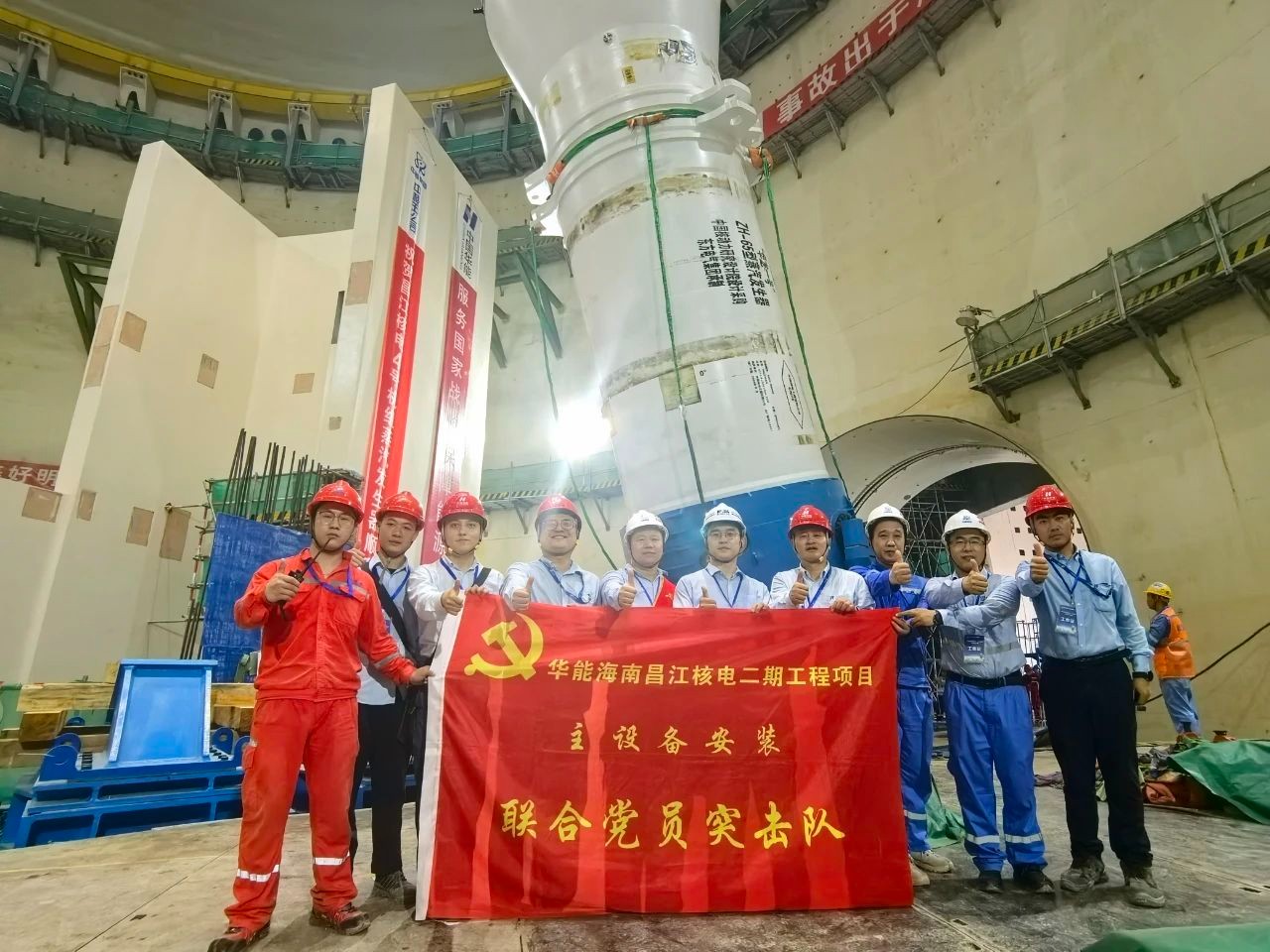 期间台风“摩羯”来临,为保证4号机组首台蒸汽发生器顺利吊装,华能海南昌江核电组织各参建单位成立主设备安装专项组,万众一心,全力以赴,安全高质量的快速完成蒸汽发生器翻转抱环安装工作,在台风来临前将蒸汽发生器转运至核岛内部,保证设备安全。台风过后,4号机组迎接了第一台主设备大件吊装,经过水平吊装、运输、翻转竖立、移位吊装、精准对中一系列过程。开展蒸汽发生器吊装工作沙盘推演,通过建立每日碰头会制度,提前梳理各项先决条件,逐项核对查验,夯实人力资源保障,确保技术准备扎实,吊装过程中人员盯紧每个吊装工序,严格把控现场安全和质量,最终安全高质量顺利实现蒸汽发生器精准就位。