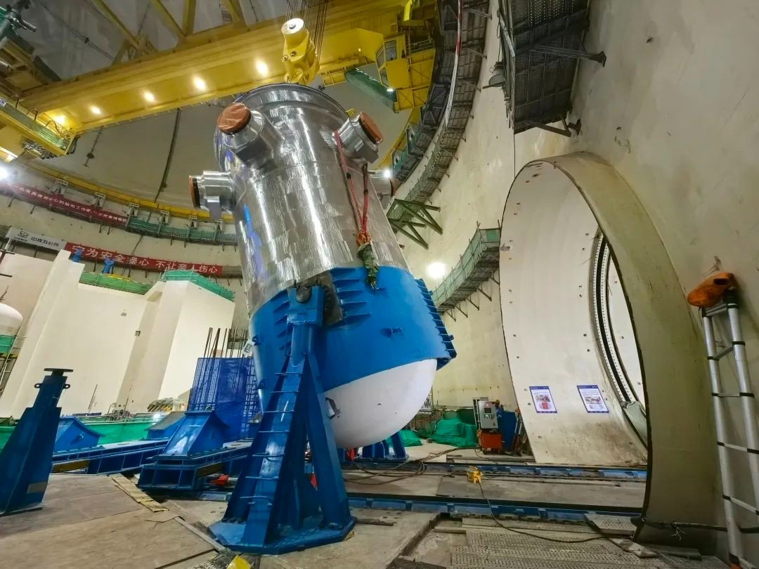 2024年9月19日18时08分,华能海南昌江核电二期工程项目4号机组反应堆压力容器历经翻转、竖立、吊装等诸多工序后,历经9个多小时,最终顺利就位至压力容器支承环上,整个过程安全、质量全面受控,实现了又一重大一级里程碑,为后续4号机组主管道冷热段焊接奠定了坚实基础,标志着4号机组进入关键部件的全面安装阶段。
