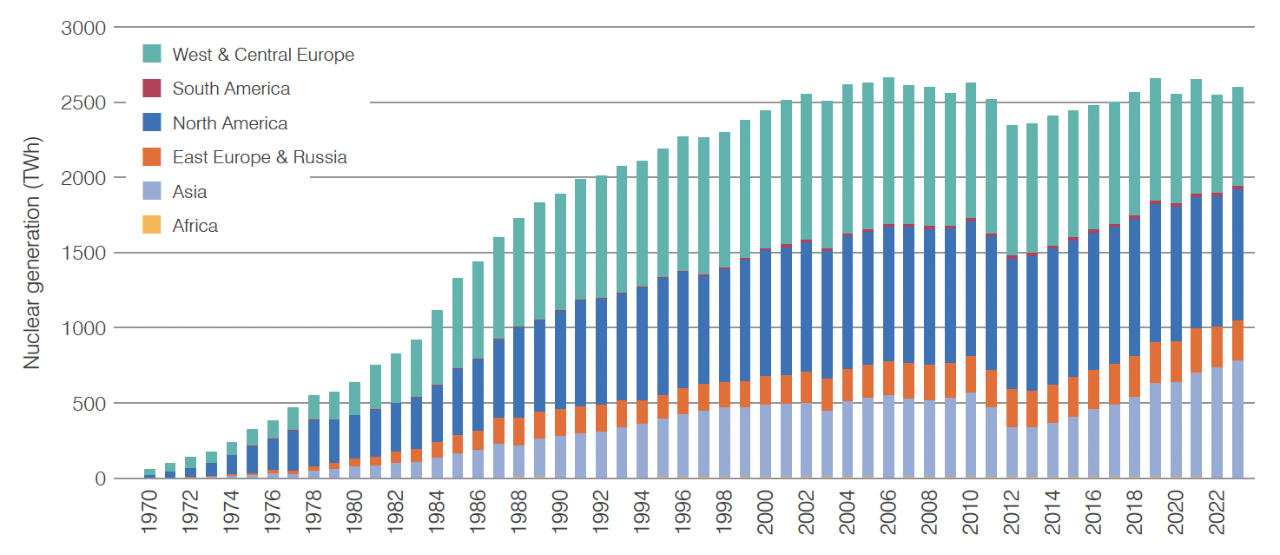 图1展示了全球核能电力生产的历年变化,自1970年开始,全球核能发电量稳步增长,直到2006年达到峰值后略有下降。最近几年,全球核能发电量再次呈现上升趋势。2023年,全球核反应堆共发电量为2602太瓦时(TWh),相较于2022年增加了58 TWh,尽管这一数值仍比2021年低51 TWh。法国核电站维修后重启,增加了42 TWh,显著推动了全球核能发电量的增长。