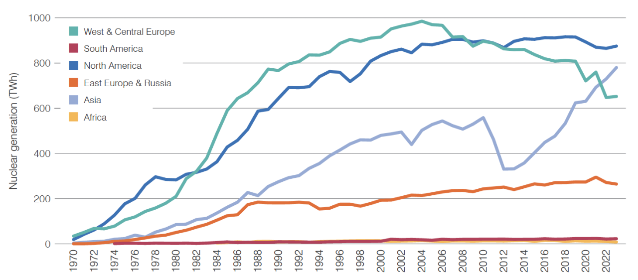 亚洲(浅蓝色):亚洲的核能发电量自2000年以后显著上升,尤其是近年来中国、韩国和巴基斯坦等国家的新反应堆并网增加,成为全球增长最快的地区。