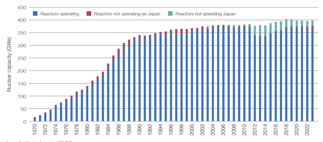 2023年,全球可运行的核电站容量为392吉瓦(GWe)。其中日本和印度共有21吉瓦的核反应堆装机容量处于暂时停运状态,还有其他地区9吉瓦的核反应堆装机未投入使用,如乌克兰的扎波罗热核电站的6个反应堆就有近6吉瓦的容量未运行。