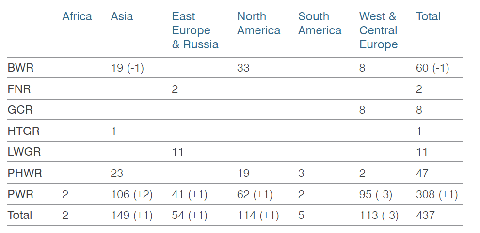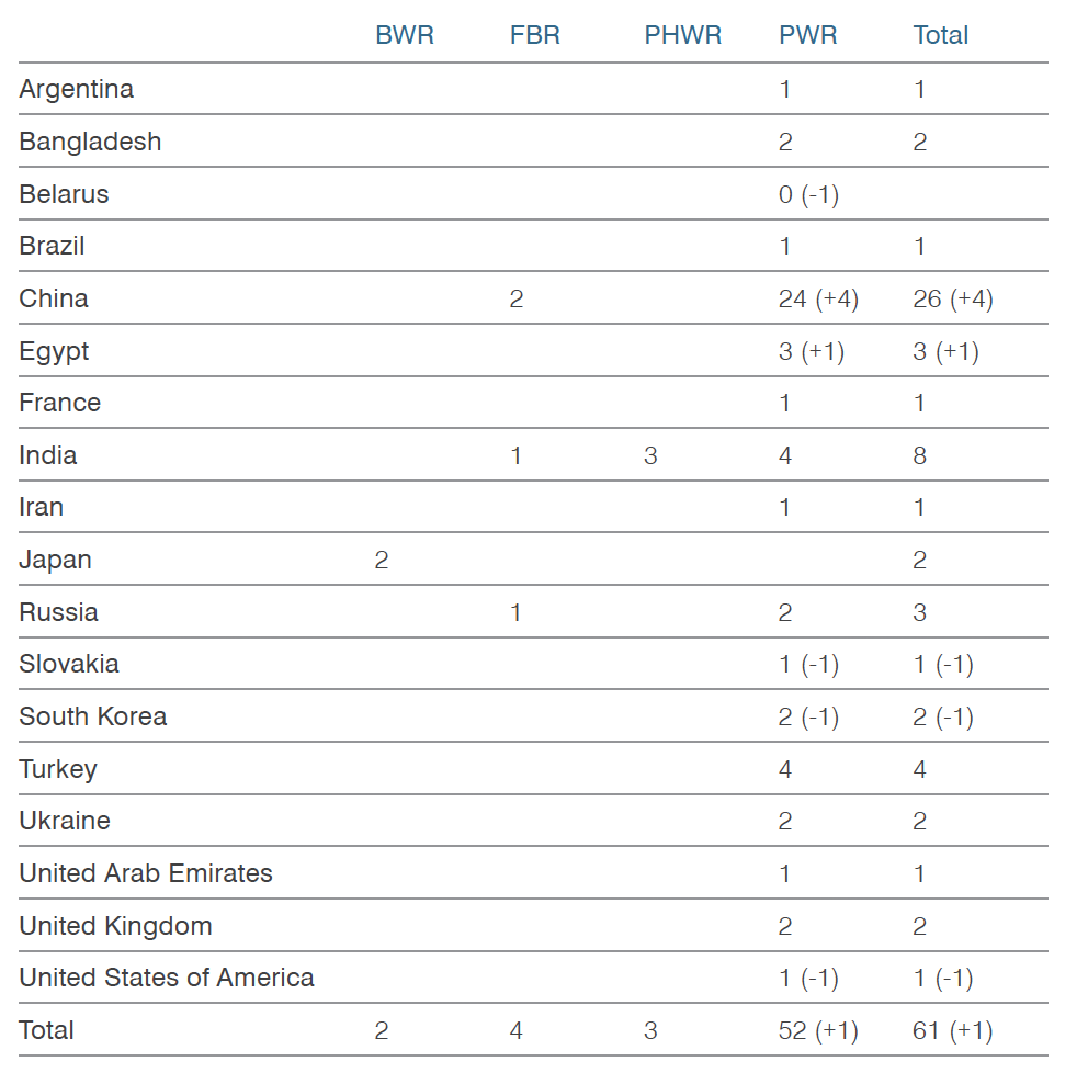 中国、斯洛伐克、美国、白俄罗斯和韩国各有一座新反应堆开始并网发电。另有五座反应堆则永久关闭,其中比利时和中国台湾各有一座,德国有三座,这些机组都因废核政策而被关闭。