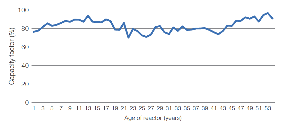 尽管核反应堆的运行绩效存在差异,但并没有随着时间的推移而下降。另外,当运行期为25年至35年时,核反应堆的平均容量因子较低,当运行期超过45年时,容量因子往往高于均值。