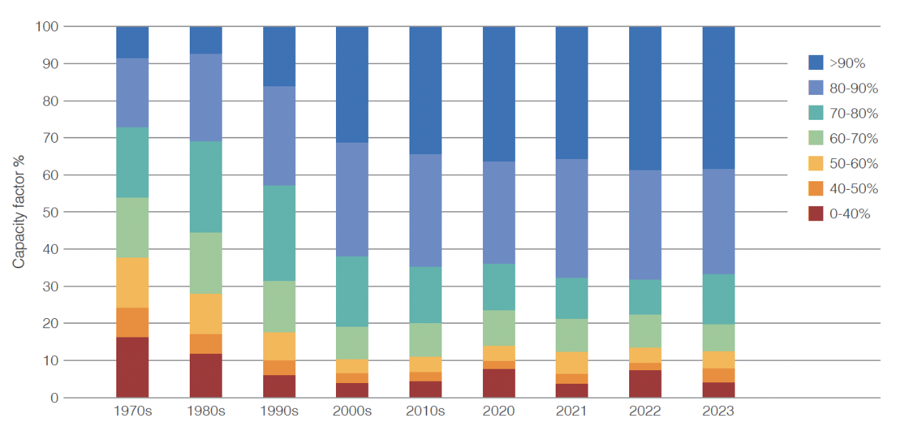 图6展示了自1970年代以来全球核反应堆平均容量因子在过去几十年中的逐步提升的长期趋势。不同颜色代表了不同容量因子区间的反应堆所占的比例。从1970年到2023年,核反应堆的平均容量因子显著提升。特别是在1990年之后,容量因子为80-90%和>90%的反应堆比例大幅增加,说明全球核电站的运行效率不断提高。