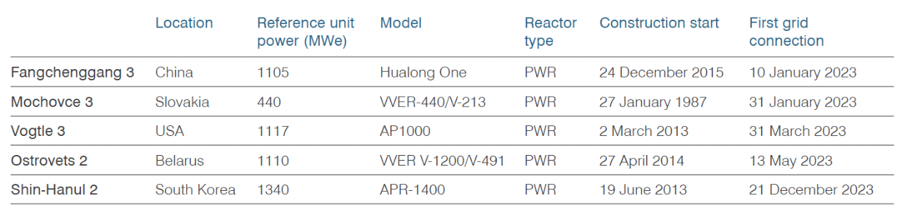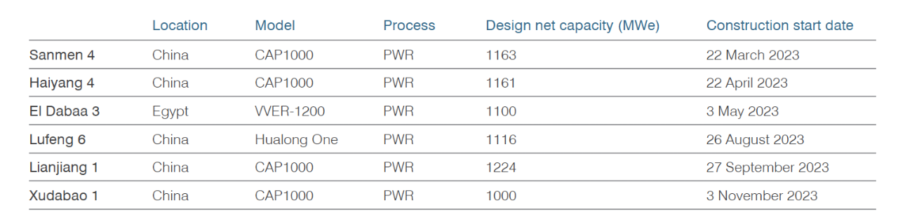 2023年,全球新开工建设了六座大型压水堆,其中五座位于中国,一座位于埃及的El Dabaa核电站。四座反应堆(三门4号机组, 海阳4号机组, 廉江1号机组, 徐大堡 1号机组)采用CAP1000型号。埃及El Dabaa 3号机组采用VVER-1200,中国的陆丰6号机组采用华龙一号。这些反应堆的设计净容量较大,从1000MWe到1224MWe不等。显示出新一轮核电建设的高效能和技术先进性。这些反应堆的建设开始日期在2023年3月到11月之间。例如,中国三门4号机组和海阳4号机组在2023年3月和4月开工,而埃及的El Dabaa 3号机组则在5月开工。