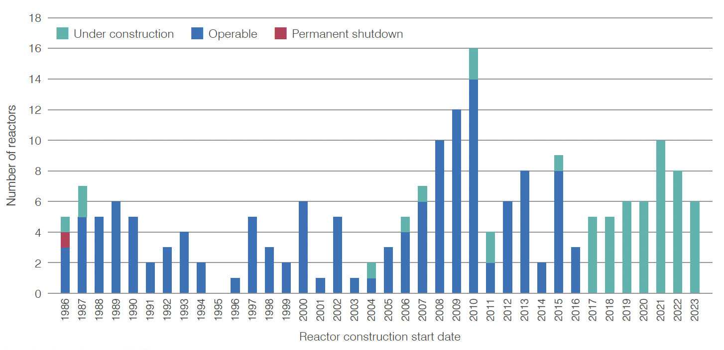 从2009年起,核反应堆建设显著增加,特别是在2010年,新增了多个核反应堆建设项目。但受福岛核事故影响,新建项目又一度停止。2017年后新的核反应堆建设又逐渐增多。大多数在建的核反应堆是在最近7年内启动的,还有一些中断多年的反应堆项目又重新启动,如斯洛伐克的Mochovce 3号、4号机组分别于1986年和1987年开建,1990年停建,2015年才重新启动。Mochovce 3号机组已于2023年1月并网,Mochovce 4号机组仍在建设中。
