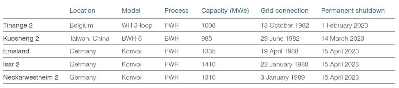 2023年关闭的五座核反应堆分别来自比利时、中国台湾和德国。这些反应堆在全球核电历史上运行多年,但由于去核政策原因而被永久关闭,表5展示了2023年永久关闭的五座核反应堆的详细信息。