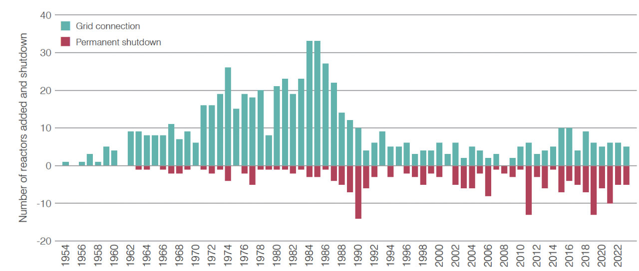 图9展示了核电发展的历史趋势,反映了自1954年至2023年全球核反应堆首次并网和永久关闭的数量变化。从1954年开始,核反应堆的并网数量(绿色)逐渐增加,尤其是在1970年至1989年达到了高峰期,每年并网的反应堆数量有时超过20座。特别是1985年至1986年,核电建设热潮达到顶峰,随后并网数量开始减少。自1990年以来,全球核电的扩展速度放缓,并且永久关闭(红色)的反应堆数量逐渐增加,特别是在一些实施核能淘汰政策的国家和地区,永久关闭的反应堆数量显著超过新并网的反应堆数量。2023年,有五座核反应堆并网,同时也有五座核反应堆永久关闭,因此2023年的全球可运行核反应堆数量没有净变化。
