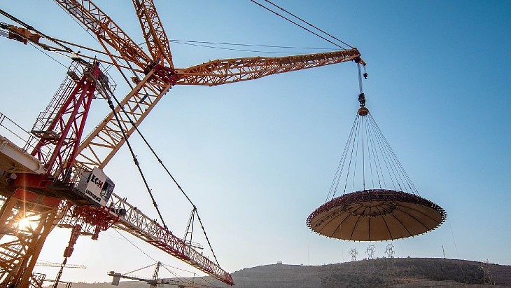 该穹顶直径为 34.7 米,重 147.6 吨,在 30 名专家的监督下,使用履带式自行式起重机将其吊装到位。