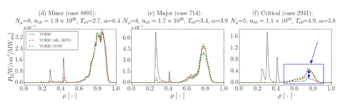 氘的加热曲线显示在 (d) 次要、(e) 主要和 (f) 严重异常值案例中。黑色表示原始数字代码与异常值特征(峰值)一起显示。红色显示 AI 模型的预测。绿色显示更正后代码的预测,AI 模型预料到这些预测,甚至预测更高的加热。(图片来源:Álvaro Sánchez-Villar / PPPL)