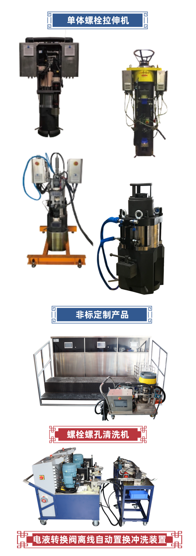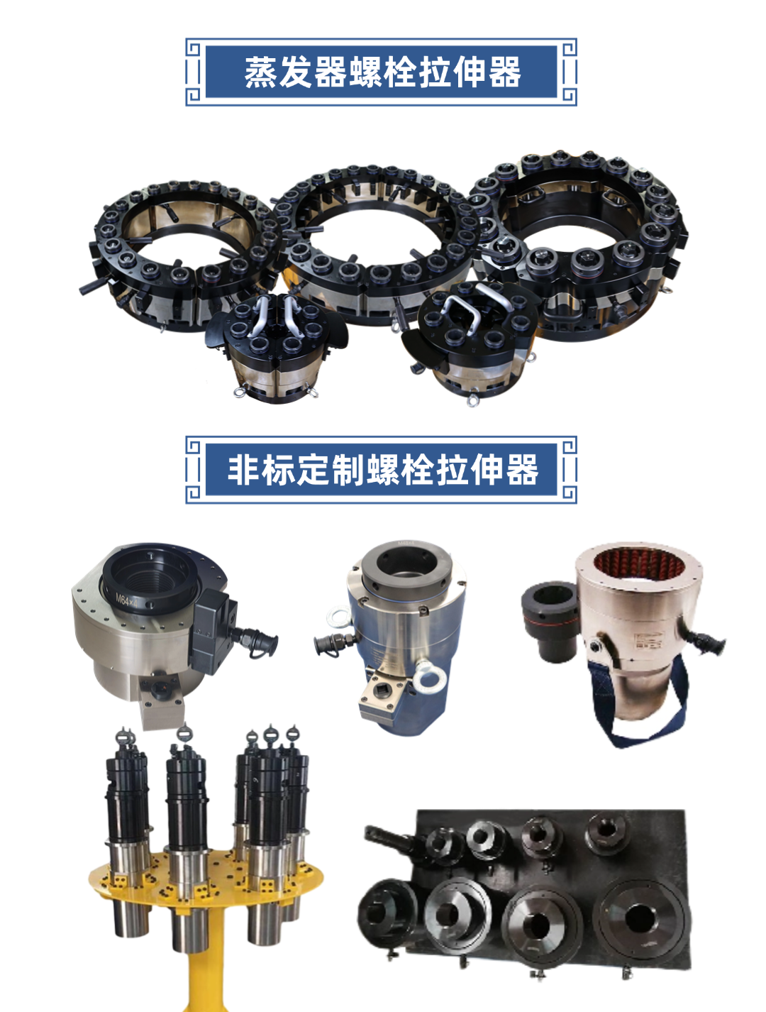 公司主营产品有液压螺栓拉伸器、扭矩扳手、液压千斤顶、超高压液压泵站等标准化工业产品,还可根据客户的特殊需求,提供非标定制产品,多年来服务于核电、石油石化、风电等众多领域客户。