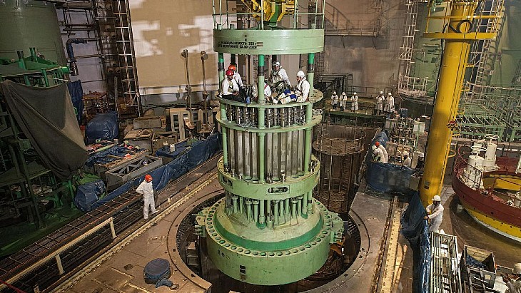 反应堆装配过程包括安装反应堆内部设备,如轴和挡板、装载假燃料和安装保护管单元。下一阶段是液压试验。