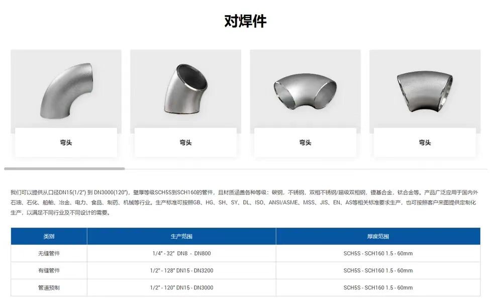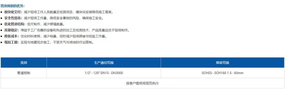 我们可以提供从口径DN15(1/2") 到 DN3000(120"),壁厚等级SCH5S到SCH160的管道预制,且材质涵盖各种等级:碳钢,不锈钢,双相不锈钢/超级双相钢,镍基合金,钛合金等。产品广泛应用于国内外石油、石化、船舶、冶金、电力、核能、食品、制药、机械等行业。生产标准可按照GB、HG、SH、SY、DL、ISO、ANSI/ASME、MSS、JIS、EN、AS等相关标准要求生产,也可按照客户来图提供定制化生产,以满足不同行业及不同设计的需要。