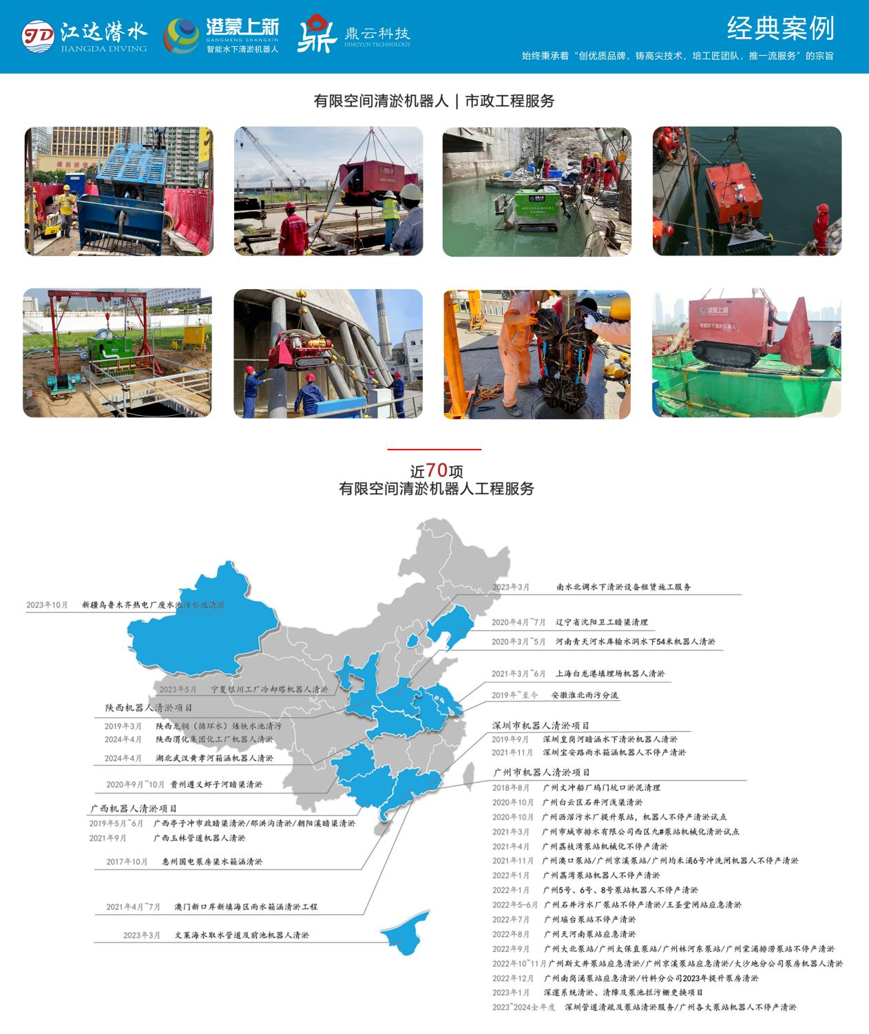 广州市江达潜水疏浚工程有限公司成立于2006年,是一家专业从事水下工程服务和研发制造水下机器人的综合性高新技术企业。2019年被中国潜水打捞行业协会授予潜水服务能力与信用评估二级证书;有限空间清淤机器人已经在70多个项目上完成施工,在2 0 2 0年获得中汽检测产品认证的产品合格证书和符合欧盟法律法规相关安全标准及允许进入欧盟及欧洲贸易自由区国家市场的CE认证证书。2021年入库国家科技型中小企业,被评为“2023年上半年创新型中小企业”,2023年获得专精特新认证。