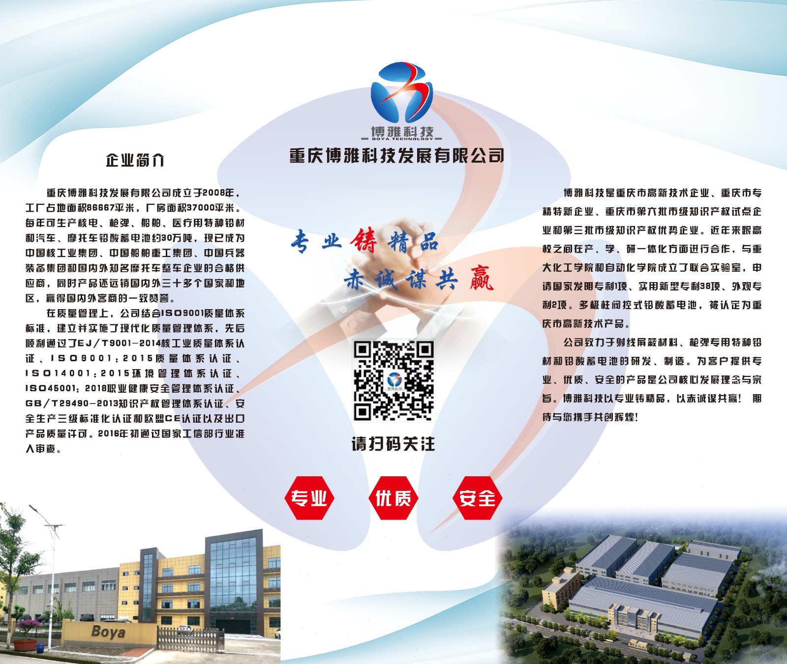 重庆博雅科技发展有限公司成立于2008年,工厂占地面积86667平米,厂房面积37000平米。每年可生产核电、枪弹、船舶、医疗用特种铅材和汽车、摩托车铅酸蓄电池约30万吨,现已成为中国核工业集团、中国船舶重工集团、中国兵器装备集团的合格供应商。在质量管理上,公司通过了EJ/T9001-2014核工业质量体系认证、ISO9001:2015质量体系认证、ISO14001:2015环境管理体系认证、ISO45001:2018职业健康安全管理体系认证、GB/T29490-2013知识产权管理体系认证、安全生产三级标准化认证。博雅科技是重庆市高新技术企业、重庆市专精特新企业,申请国家发明专利1项、实用新型专利38项、外观专利2项。公司致力于射线屏蔽材料、枪弹专用特种铅材和铅酸蓄电池的研发、制造。为客户提供专业、优质、安全的产品是公司核心发展理念与宗旨。博雅科技以专业铸精品,以赤诚谋共赢! 期待与您携手共创辉煌!