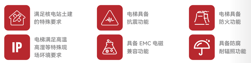 为顺应能源低碳转型大潮,响应国家实现清洁、低碳、可持续发展的号召,东南电梯积极投入核电专用电梯的自主创新和研发制造,为核电产业发展提供垂直交通系统解决方案。核电电梯主要安装在核岛厂房、汽机房、BOP厂房等部位,用于人员及设备的提升运输,满足核电站抗震、防腐、耐辐照、耐火、温湿度、EMC等特殊要求。同时,在核岛安全壳以及其他特殊部位安装吊篮、爬梯、升降平台等提升装置,用于特殊设备的提升运输,助力核电产业发展。