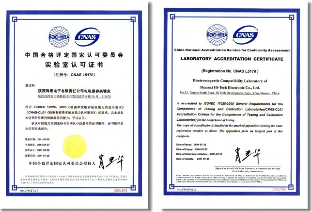 海泰电子自筹4100万元资金建立了如图8.1所示的电磁兼容实验室,该实验室依据CNAS-CL01《检测和校准实验室能力认可准则》(idt ISO/IEC 17025)、CNAS-CL16《检测和校准实验室能力认可准则在电磁兼容检测领域的应用说明》和CNAS-RL01《实验室认可规则》等标准,结合自身实际情况,建立了质量管理体系,通过CNAS和DILAC联合专家组的现场评审,并于2011年正式获得CNAS颁发的认可证书,2015年通过了监督评审和扩项评审,获得了包括GJB151A/152A、GJB151B、GB9254、GB4824、 GB/T17626.X和GJB1389A等标准规定的共计65个检测项目能力的认可,检测结果在国际实验室认可合作组织(ILAC)成员内互认,拥有3米法屏蔽半电波暗室、强电磁脉冲实验室、混响室、屏蔽室等实验设施,具备全面的电磁兼容测试能力,拥有检测经验丰富的测试工程师团队和整改专家,可满足军用和民用电子电气产品的电磁兼容测试、电磁兼容整改需求。