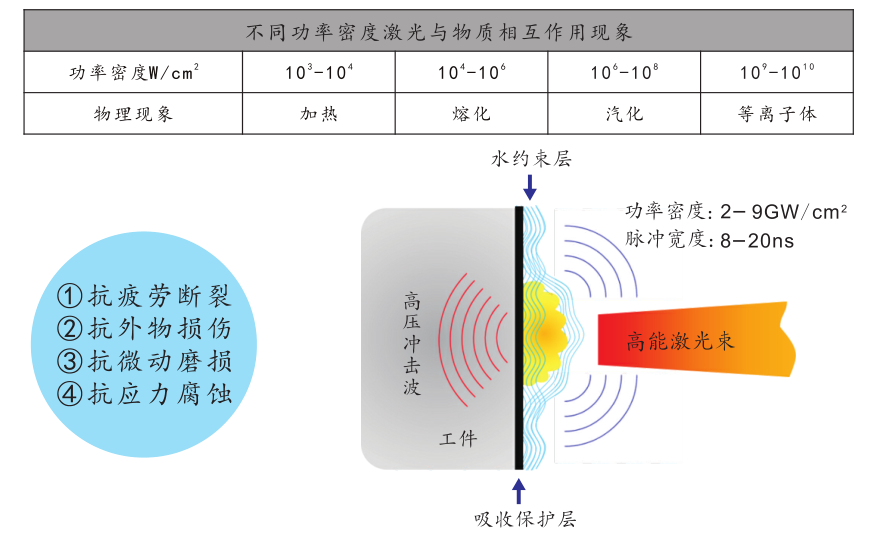 激光冲击强化,又称激光喷丸,英文Laser Shock Peening(简称LSP),是种先进表面强化技术,其利用高功率、短脉冲激光诱导等离子体冲击波的力学效应,使零件表层发生超高应变率塑性变形,引起位错密度增加、晶粒细化等变化同时形成毫米级影响深度、呈梯度分布的残余压应力,从而显著提高零件抗疲劳耐磨损和防应力腐蚀等性能,大幅提高零部件的使用寿命,有效解决装备制造业关键部件的疲劳断裂问题。